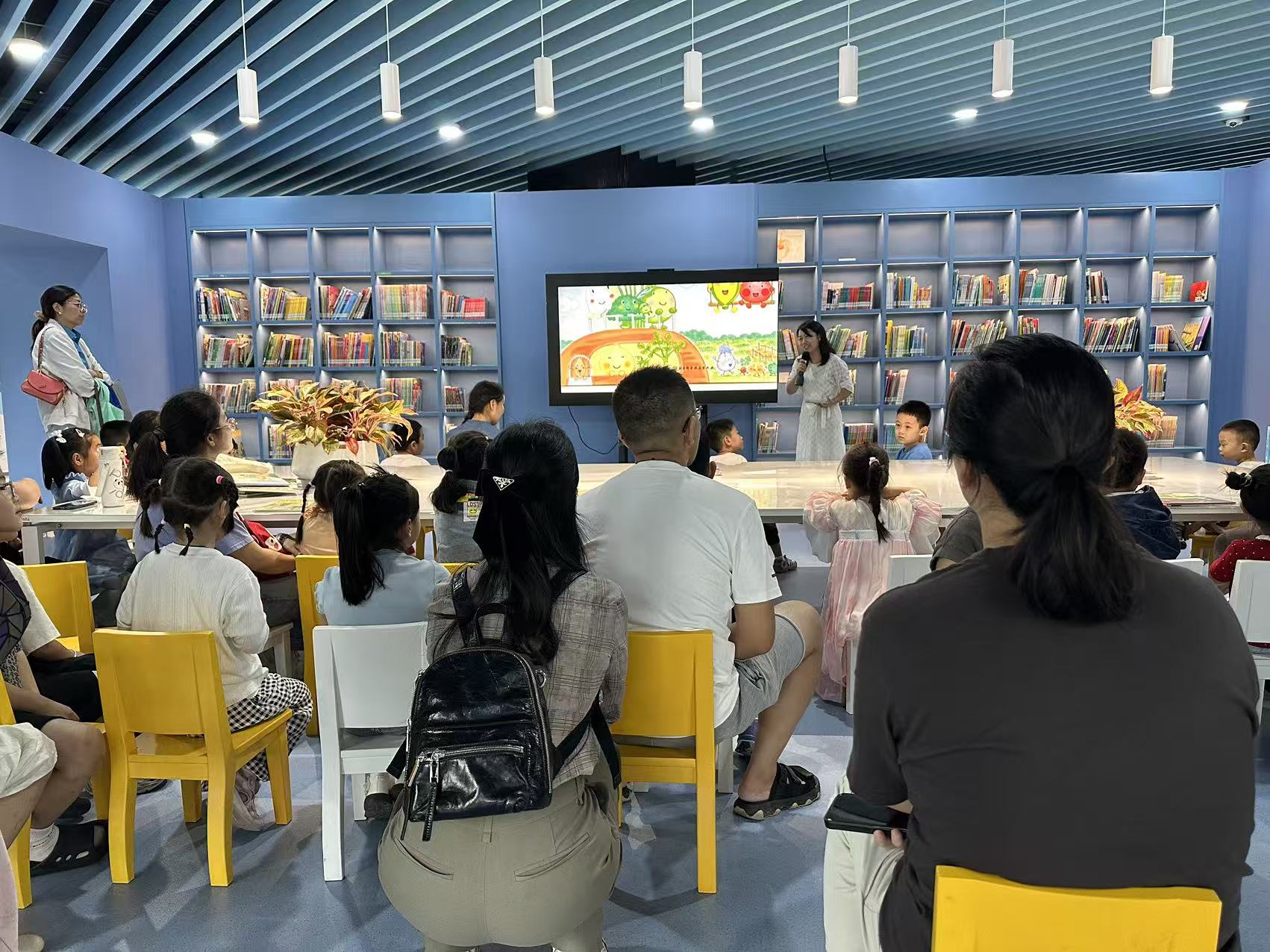 为了让这场故事之旅更精彩,本次活动特别邀请到机关二园的姜圆圆老师担任主讲人。作为长期深耕少儿教育领域的优秀教师,姜老师最懂孩子的兴趣点:她会用充满童趣的语气模仿蔬菜宝宝的对话,让故事角色 “活”起来;会用夸张又亲切的表情吸引孩子的注意力,让每个孩子都能紧跟故事节奏;还会在关键情节处抛出小问题,比如“大家猜猜,玉米宝宝的‘长发’为什么会变色呀?”“如果你是蔬菜宝宝,会怎么帮玉米解决烦恼呢?”,引导孩子主动思考、积极发言,让单向的故事讲述变成双向的互动交流。