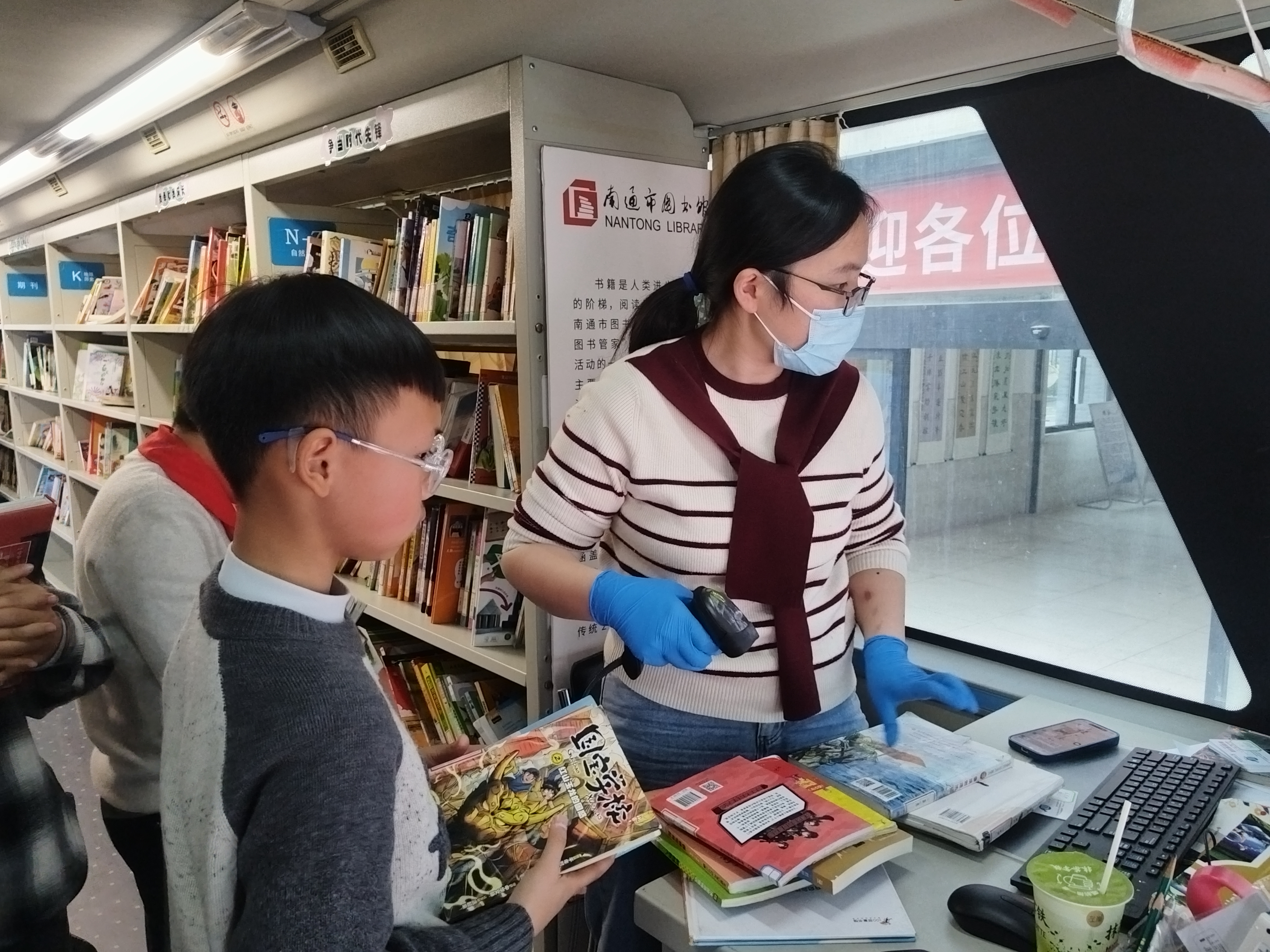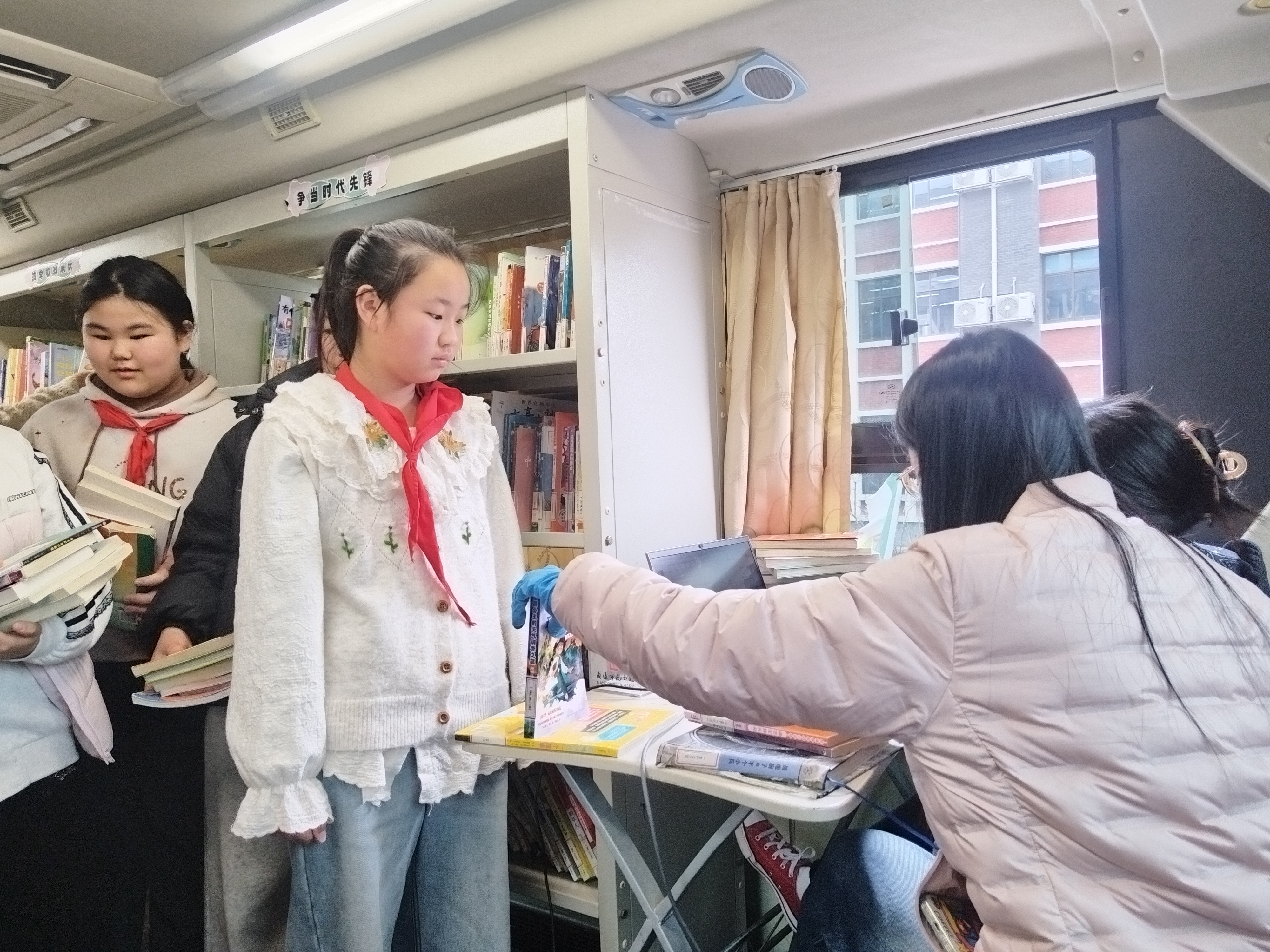 活动当天,伴随着孩子们的期待,阅读巴士缓缓驶入五里树小学,一经亮相便成为校园里最吸睛的焦点,点燃了孩子们的探索热情。作为南通市图书馆推进全民阅读、服务少儿群体的重要载体,这辆“移动书仓”内各类优质图书分门别类、摆放整齐,精准适配不同年级学生的阅读水平、认知特点与兴趣需求,宛如一座可移动的微型知识宝库,满载着墨香与新知,等待着孩子们驻足探索、汲取养分。在图书馆工作人员的有序引导下,孩子们分批登车,有序挑选心仪的书籍,车厢内满是专注与融融暖意。工作人员细致介绍书籍分类,耐心解答孩子们的疑问,让阅读与学校特色教育深度融合。孩子们在书架间穿梭,在文字中徜徉,眼神里满是对知识的渴望,每一本好书都成为他们与世界对话、与经典同行的桥梁。
