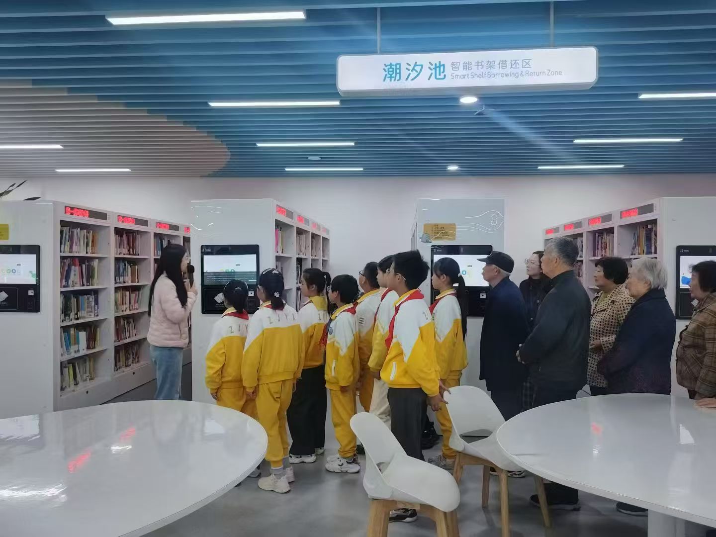 活动伊始,由馆员带领参与者参观少年儿童图书馆,一起走进智能书库,详细讲解自动化立体书库的运转机制,让老年人直观感受科技为阅读带来的变革,也让小读者体验前沿阅读科技,切实提升不同年龄段参与者的数字素养。随后,活动进入“老幼共读”环节,组成10个“1老+1-2小”共读小组,分组阅读,由学生给老党员读者讲解故事,交流心得。共读结束后,各小组代表依次登台,分享共读感悟。