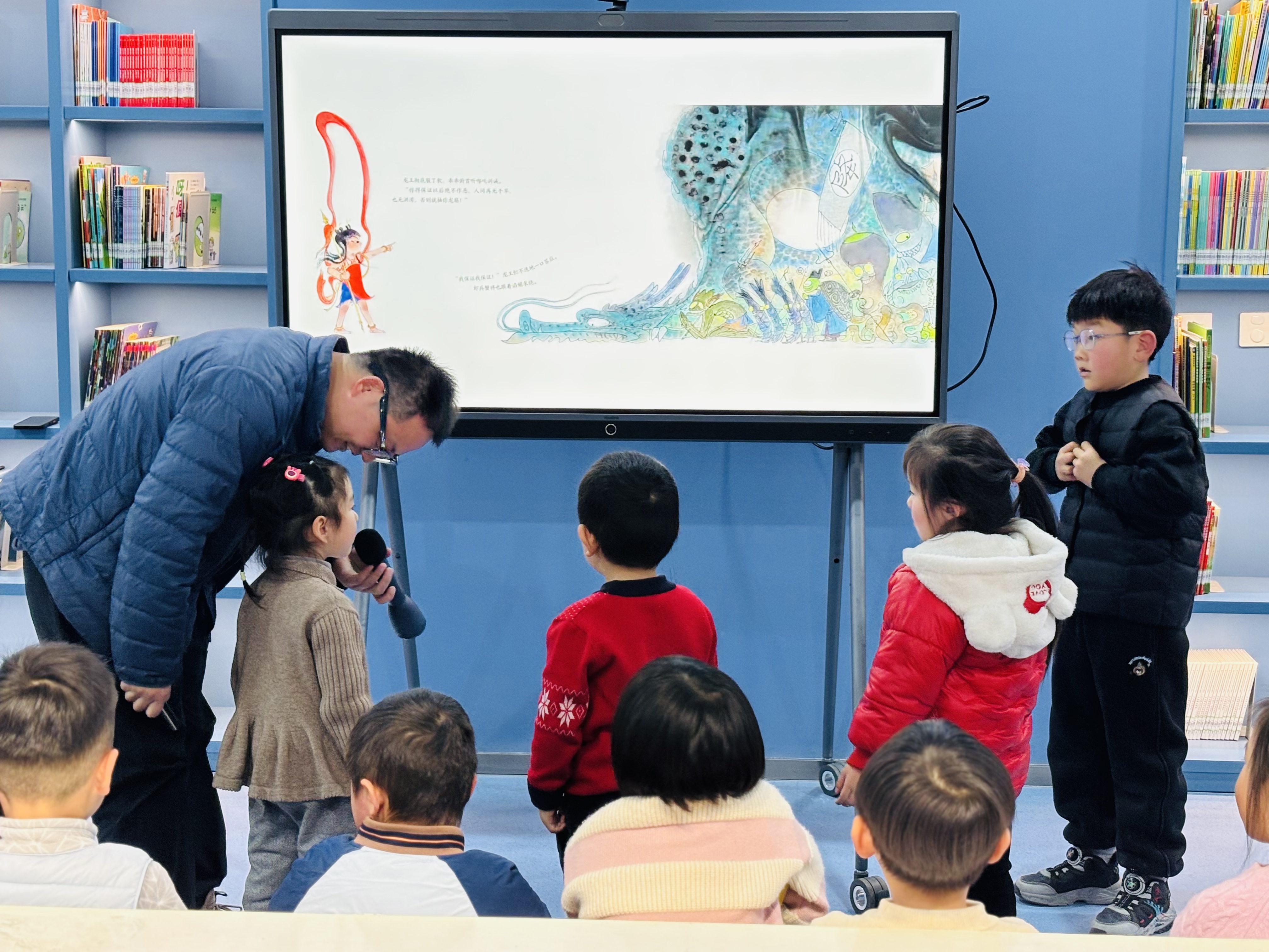 活动中,除了故事分享,还设置了趣味问答环节。陆老师围绕新书内容、神话小知识提问,孩子们举手抢答,在互动中加深了对故事的理解。