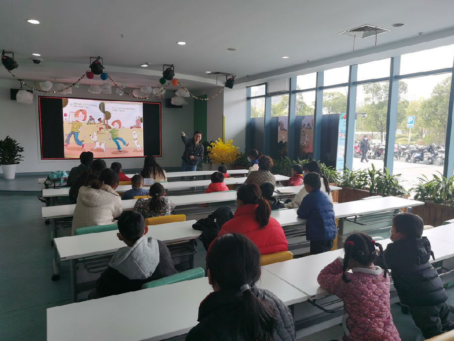 南通市少年儿童图书馆于3月6日(周日)下午开展了丽声北极星分级绘本系列之《谁的小狗》。主人公是一个小女孩,在公园玩耍的时候跑来了一只不知名的小狗。小女孩和小狗玩得很开心,小女孩希望能帮小狗找到主人。于是小女孩问公园里一位穿着风衣的绅士和一位正在遛狗的女孩,可惜两个人的回答都是否定的。小女孩和小狗来到街上,无意中见到一张寻狗启事。启事里的小狗也长着同样的长耳朵。小女孩按照地址找过去,小狗见到这一家人的时候开心得跳起来,主人也非常兴奋,但同时也注意到了失落的小女孩,小狗主人表示可以让小女孩选一只刚出生的小狗作为礼物。最后,小女孩选了一只主动扑向她的小狗,并取名为“蹦蹦”。